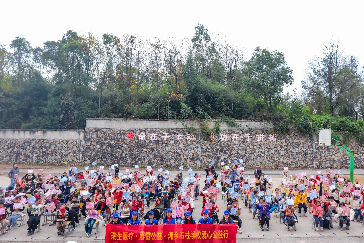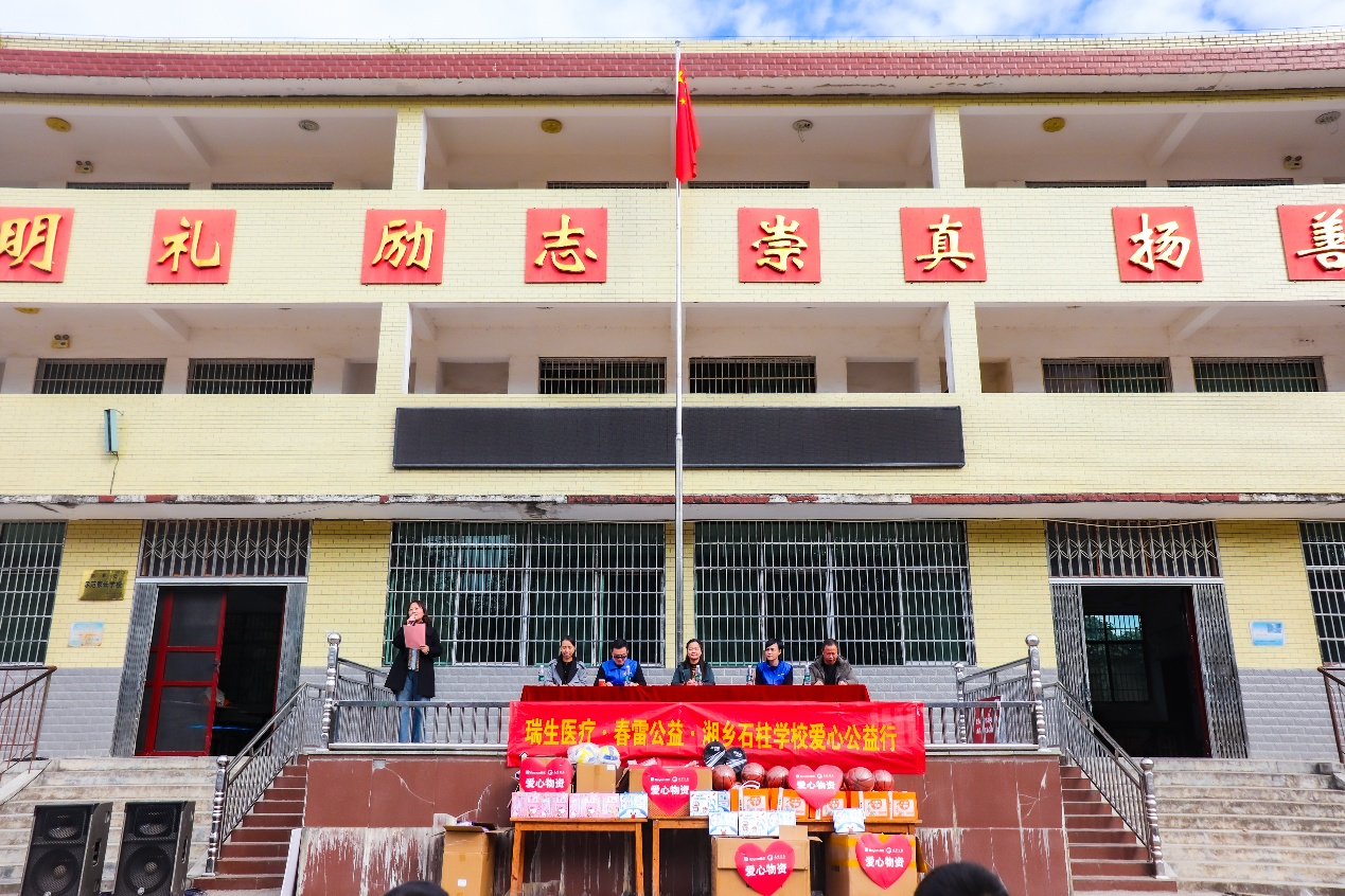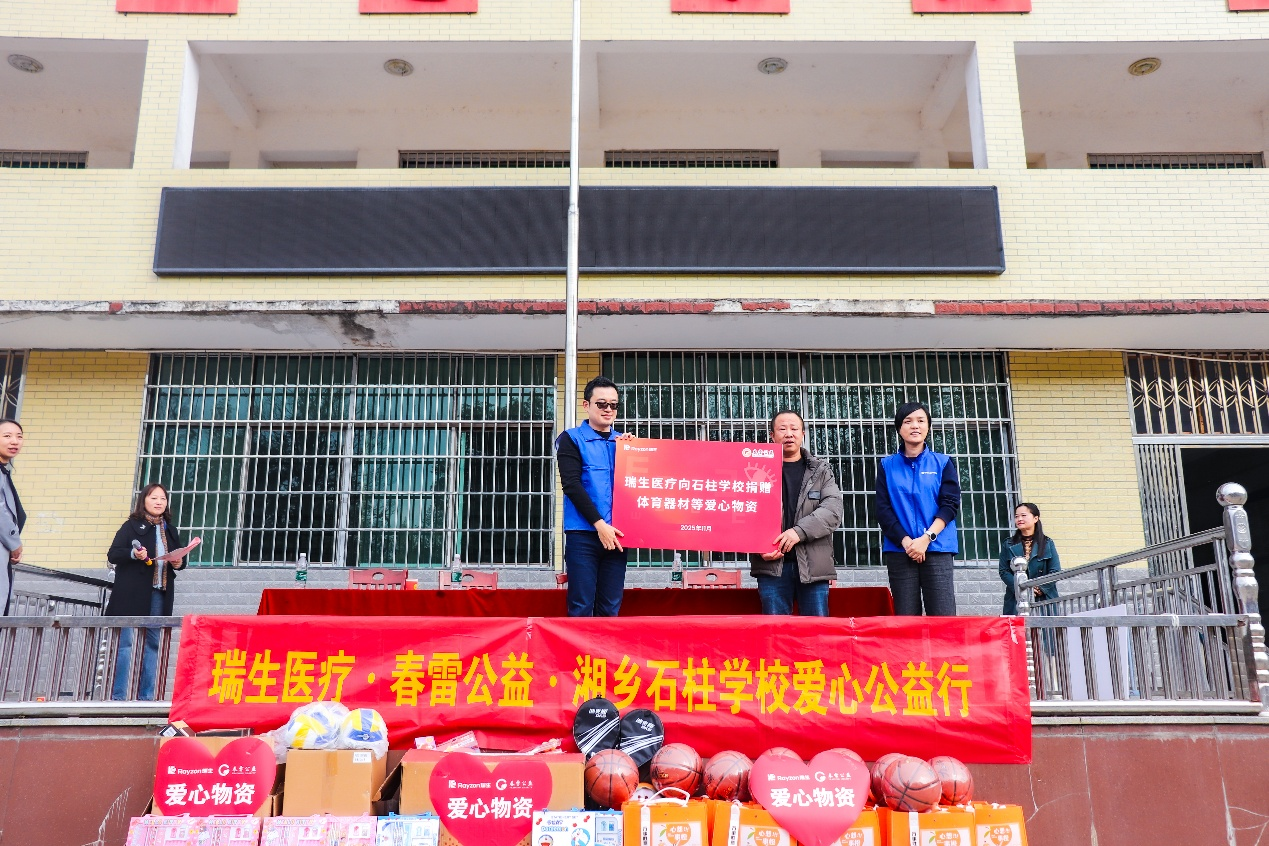 上午十点半,阳光普照,捐赠仪式在学校操场正式举行。湘乡市石柱学校田乔炎校长对瑞生医疗与春雷公益一行的到来表示热烈欢迎。他指出,乡村教育的发展离不开社会各界的支持,爱心企业带来的不仅是物资,更是对乡村孩子们未来的深切关怀。他希望同学们铭记这份大爱,刻苦学习,以优异的成绩回报社会的厚爱,未来成为爱的传递者。