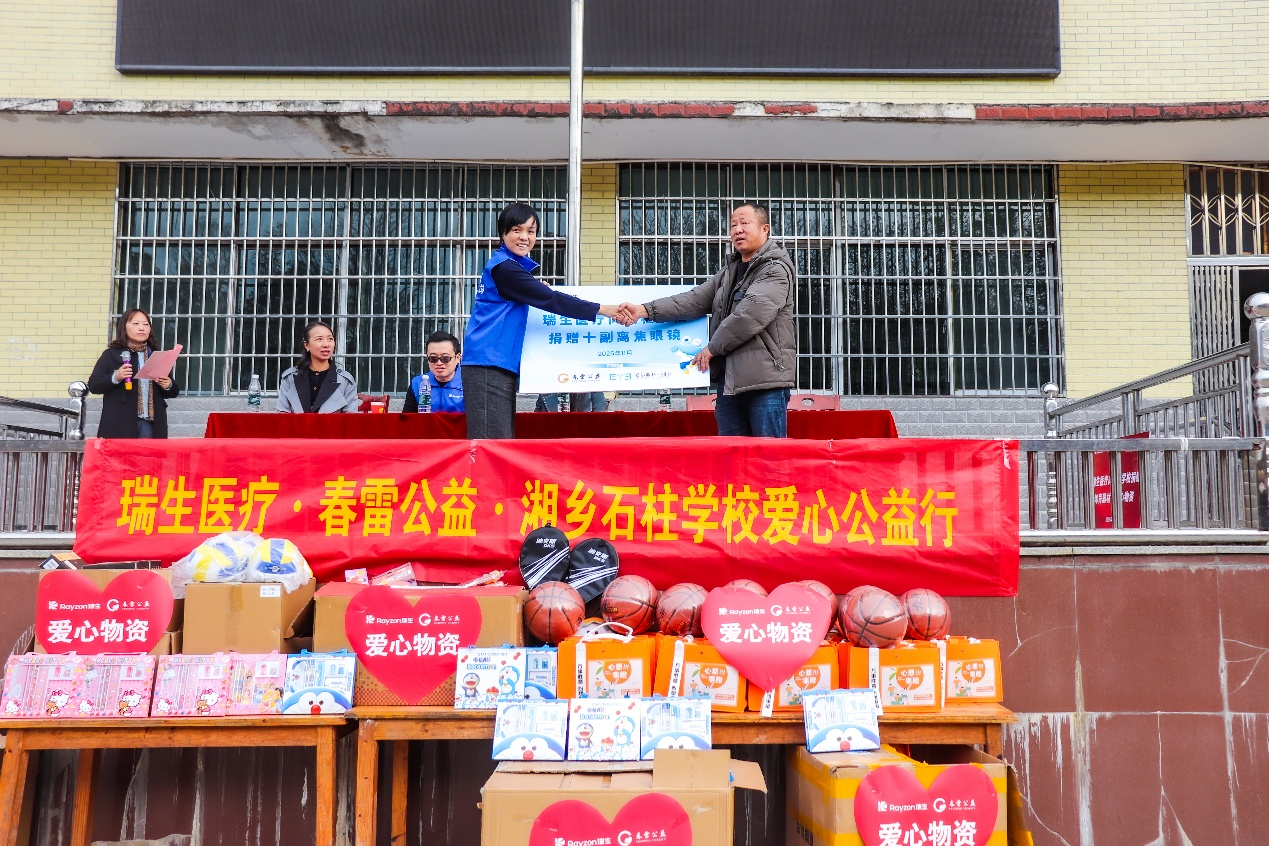 随后,瑞生医疗负责人向学校捐赠了体育器材牌匾,包括全新的乒乓球台、篮球、排球、羽毛球拍、小蜜蜂扩音器等一批崭新的文体及教学器材,并代表企业向学校捐赠了10副瑞生医疗爱柯尼®离焦眼镜,并由湘乡爱尔眼科医院免费提供全程检查,用于支持有近视防控需求的师生。